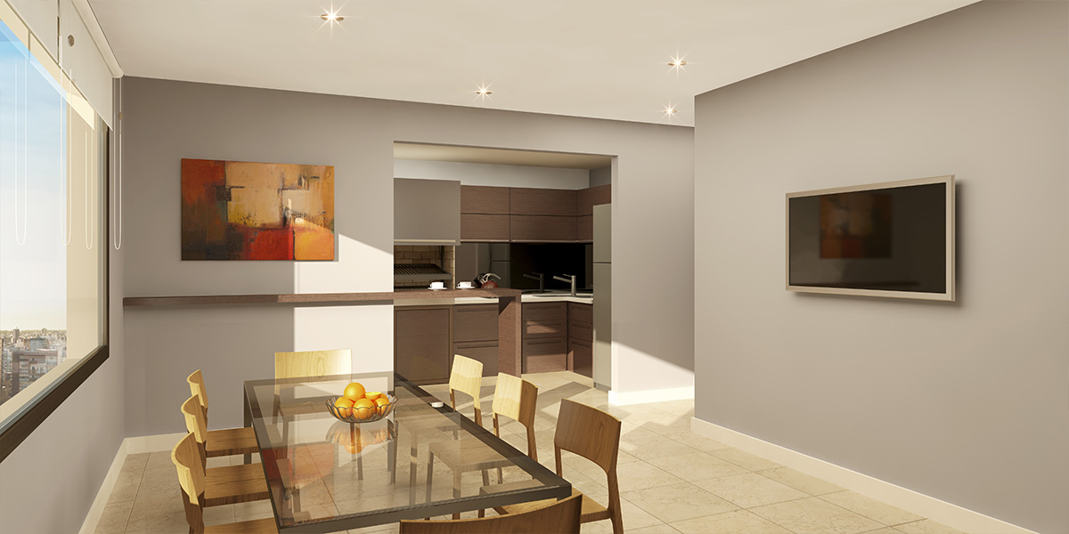 Costa Alsina cuenta en el piso 10 con luminoso Quincho de uso común, con amplia terraza en expansión, pensado de forma de otorgarle al edificio un sobrio remate y Laundry.